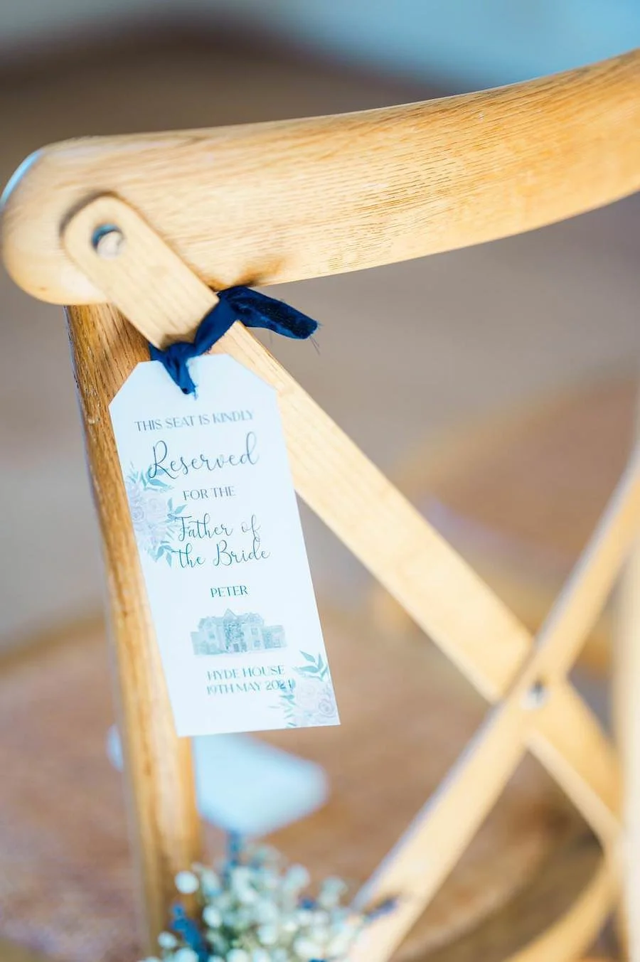 Elevate your ceremony chairs with bespoke reserved seat tags. This is a beautiful way to make sure the right seats are saved for those who mean the most to you.